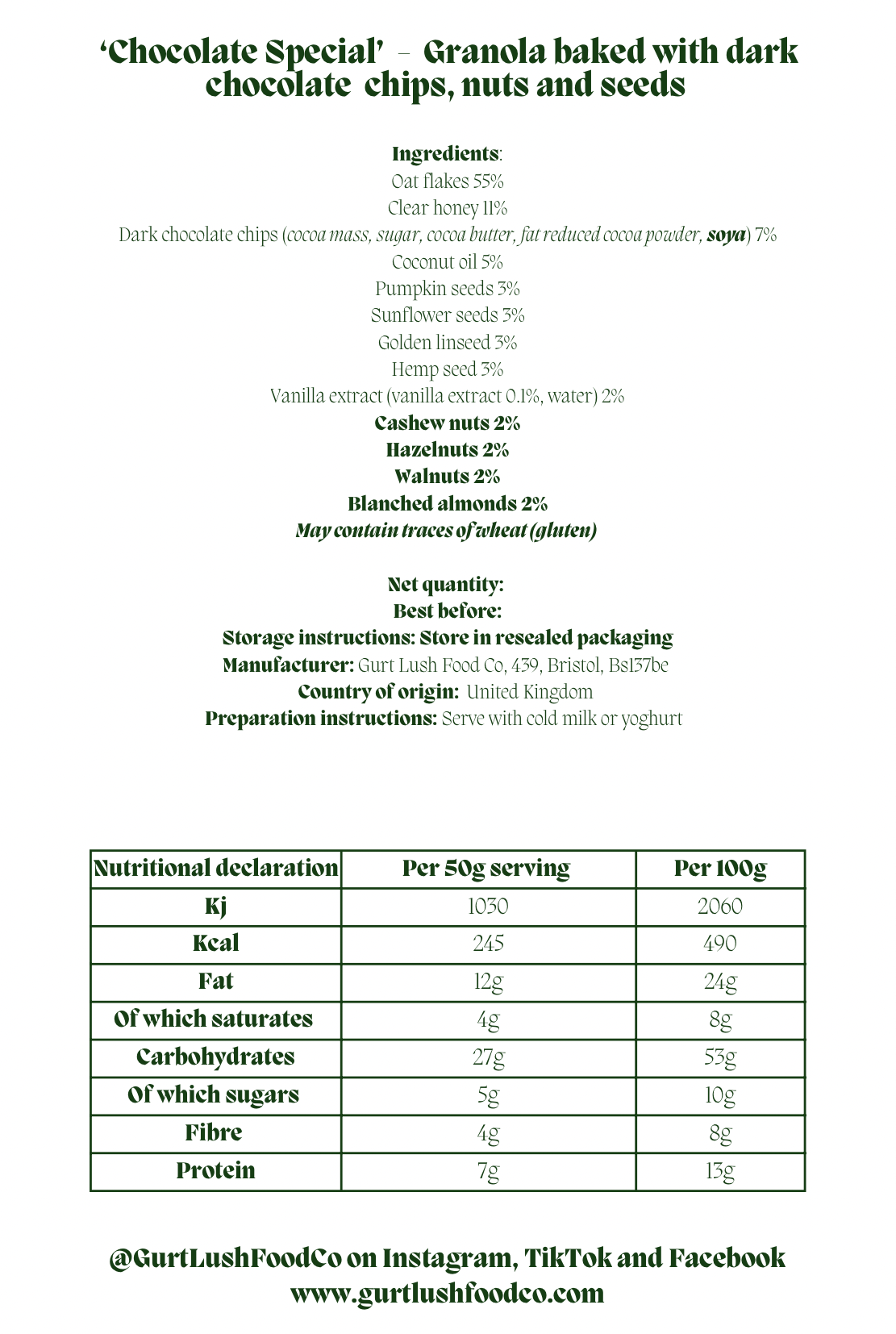 Introducing Chocolate Special—a rich, indulgent twist on our original recipe. Freshly baked in small batches, this homemade granola brings together hearty oats, golden honey, a hint of vanilla, crunchy nuts, and nutrient-dense seeds. Finished with dark chocolate chips for a smooth, satisfying sweetness, it’s everything you love about our classic granola, with a little extra indulgence in every bite. Treat yourself to something truly special.