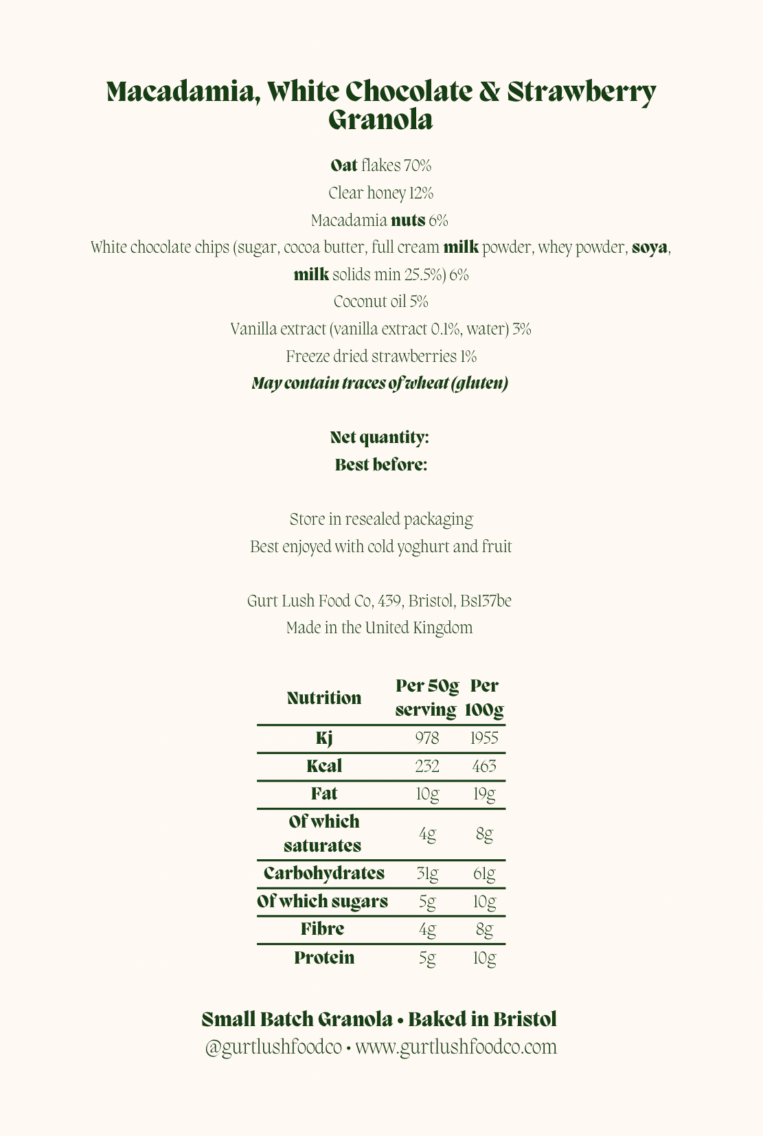 Our Valentine’s Special brings together buttery macadamia nuts, creamy white chocolate and bright freeze-dried strawberries, folded through our signature honey-baked oats. Sweetened naturally with clear honey and finished with a touch of vanilla, this granola balances richness with freshness - comforting, but never heavy.